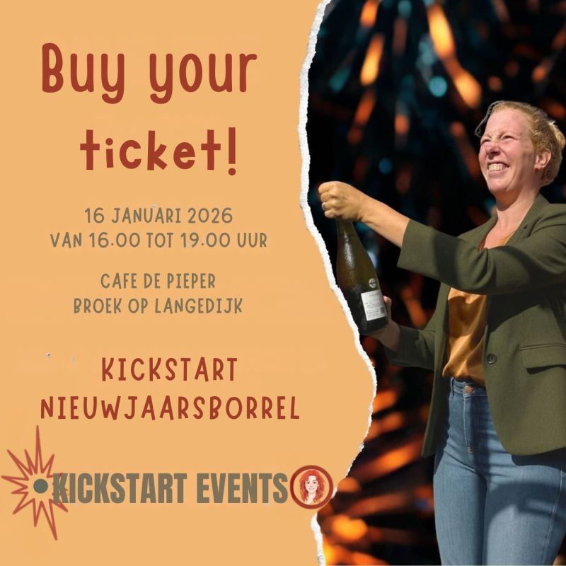 De Kickstart Nieuwjaarsborrel vindt plaats op vrijdag 16 januari 2026, van 16:00 tot 19:00 uur, bij Café De Pieper in Broek op Langedijk. De kosten bedragen 35 euro. Hiervoor krijg je drankjes, hapjes, een originele netwerkactiviteit en een goodiebag.